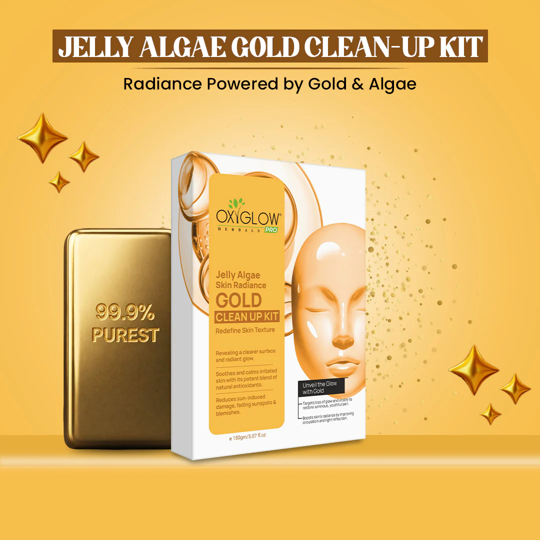 OxyGlow Jelly Algae Skin Radiance Gold Clean-Up Kit is a professional facial clean-up solution designed to enhance skin radiance, redefine skin texture, and deliver a refined glow. Enriched with Jelly Algae technology and Gold actives, this kit helps improve skin smoothness, boost luminosity, and restore a healthy, polished appearance.
